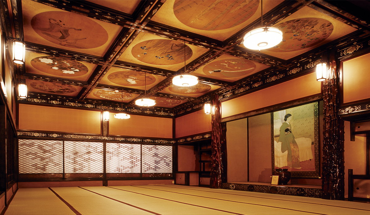 この部屋に入ったら、部屋全体がシックで重厚な落ち着く感じが印象に残りました。天井には四季の花鳥画が描かれています。