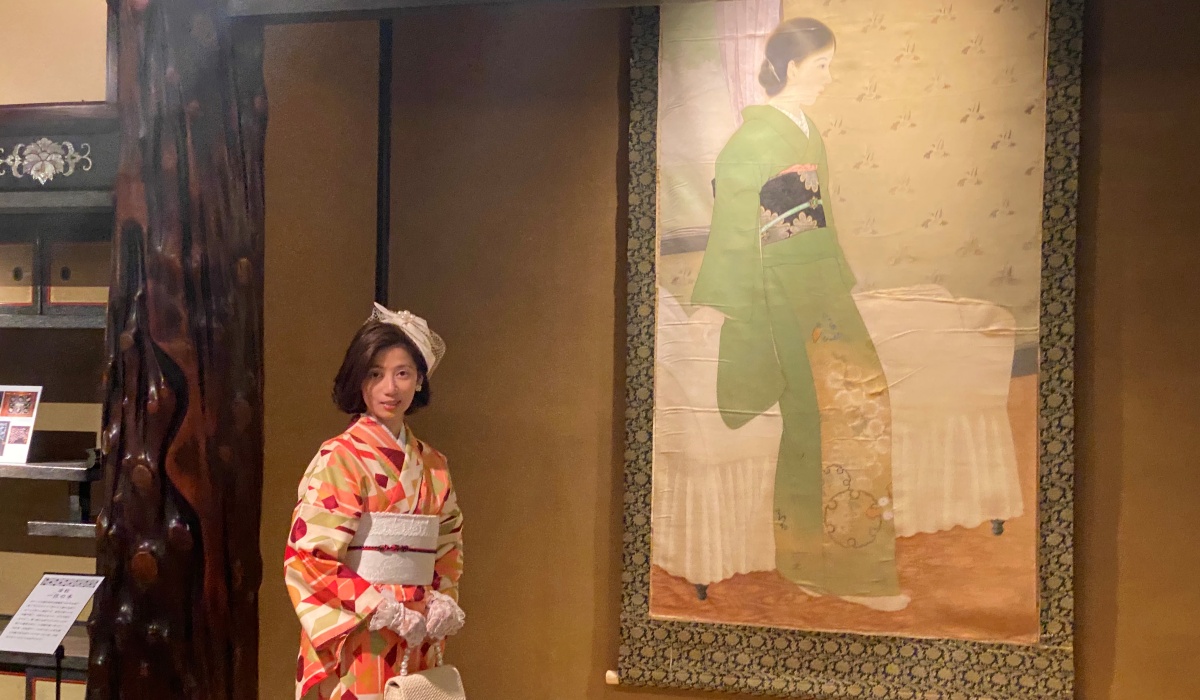 着物姿の女性の掛け軸が歴史の重みを感じさせてくれました。