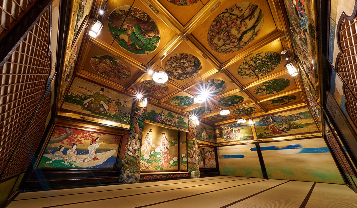 室内はすべて純金箔、純金泥、純金砂子で仕上げられていて、竜宮城に行った浦島太郎が感じた空間を感じました。