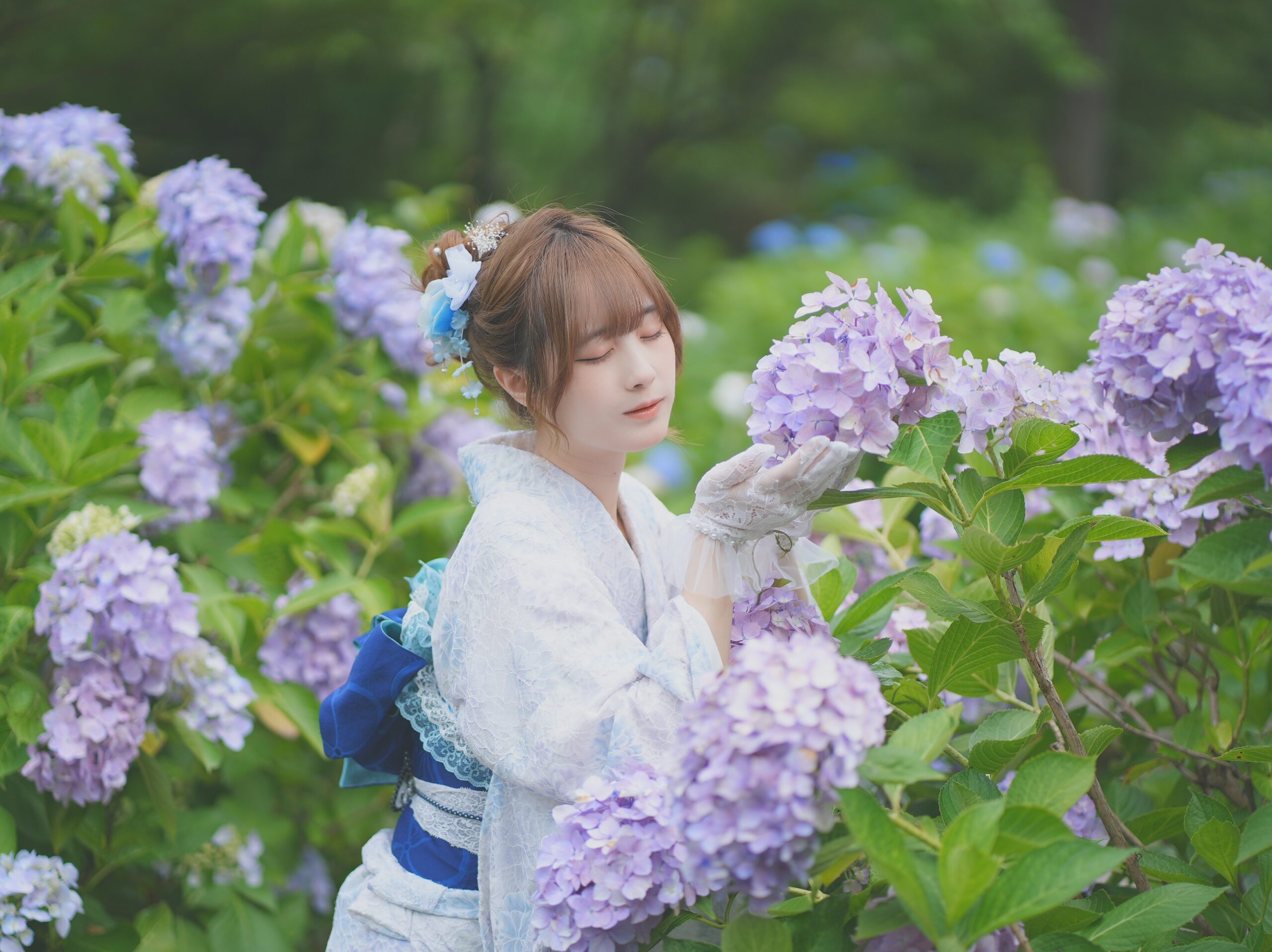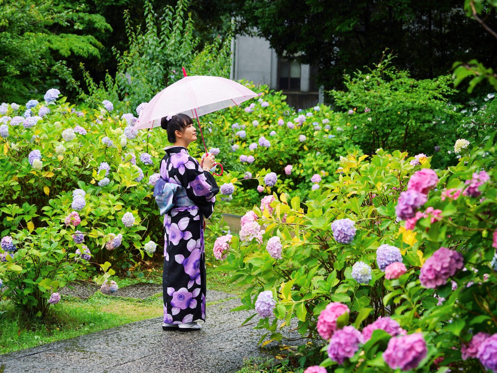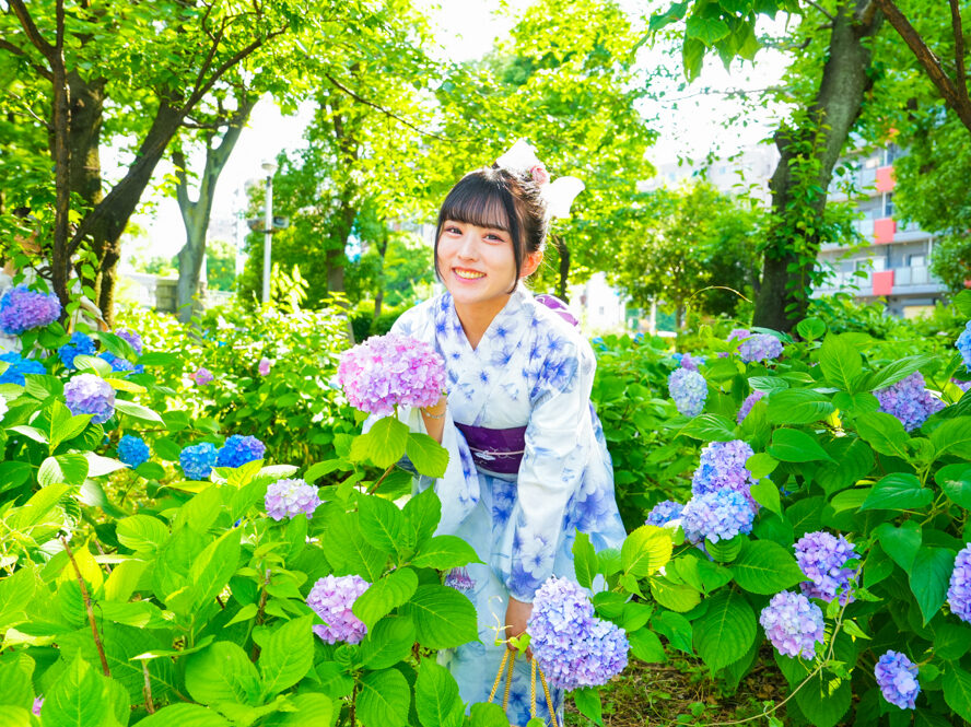 初夏の京都といえば「紫陽花(あじさい)」。 しっとりとした景色の中で楽しむ紫陽花は、着物との相性も抜群です。