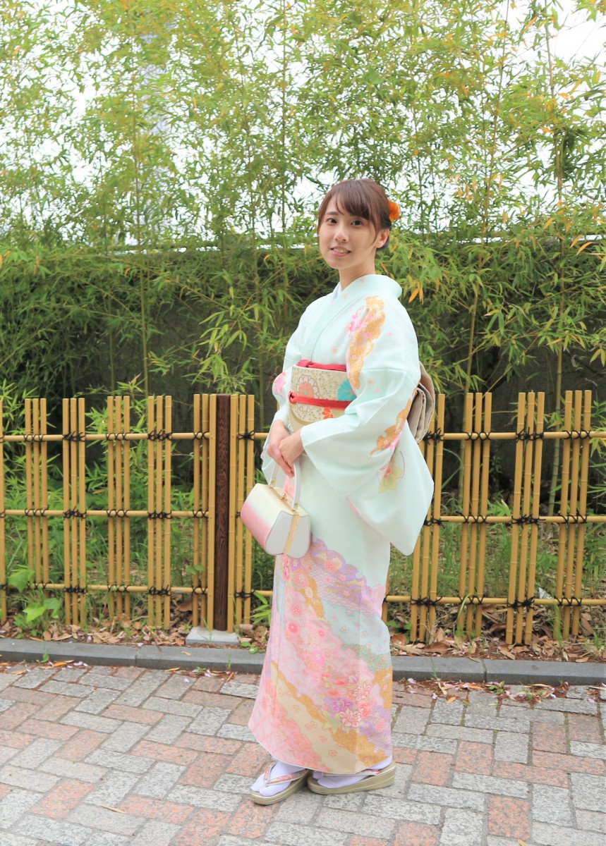シックな着物を選んだ時は、帯の色を華やかにするのがおすすめ!着付師と相談しながら色を決めていってくださいね。