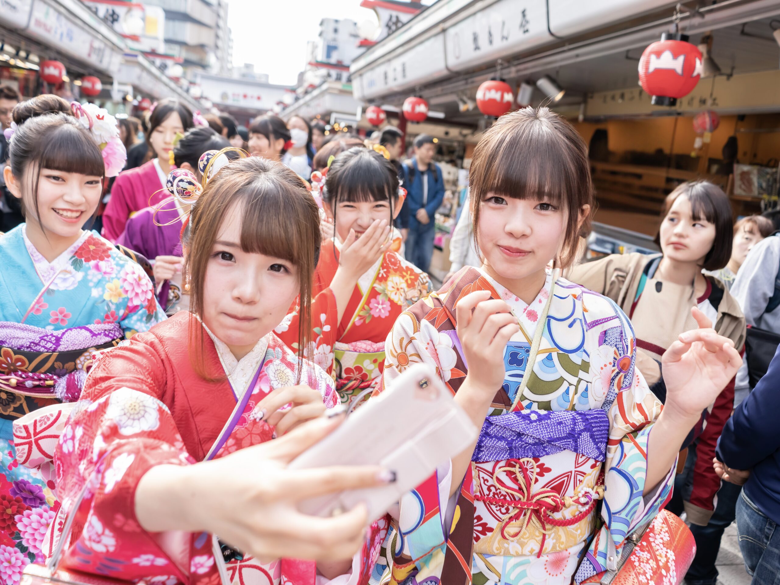 仲見世通りや裏浅草には、着物姿が映えるおしゃれなカフェや食べ歩きグルメが豊富。友達と特別な時間を過ごせます。