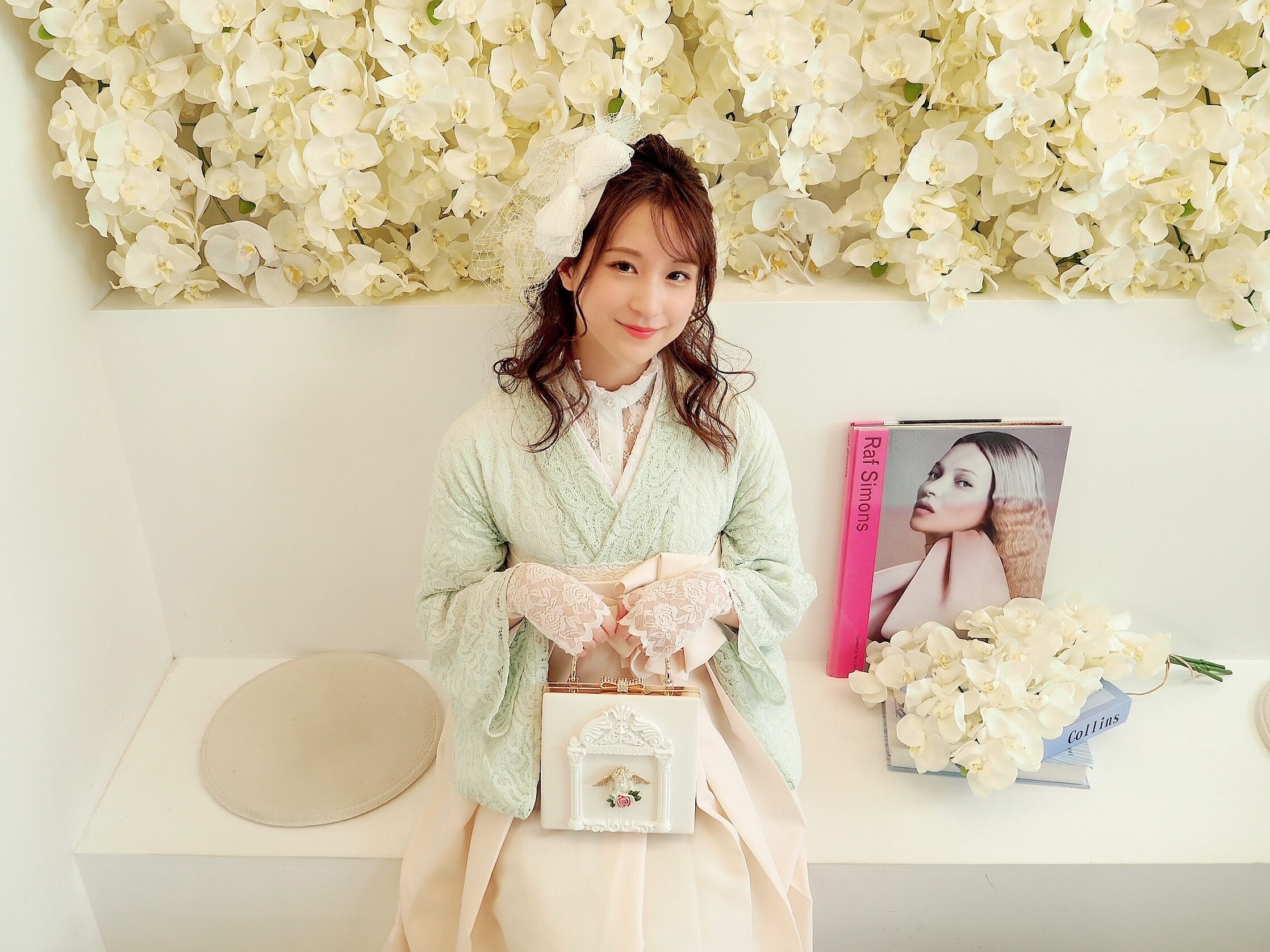 □ 女性:和服、半幅帯、刺繍衿長襦袢、裝飾結繩、日式手拿包、日式襪子、草履