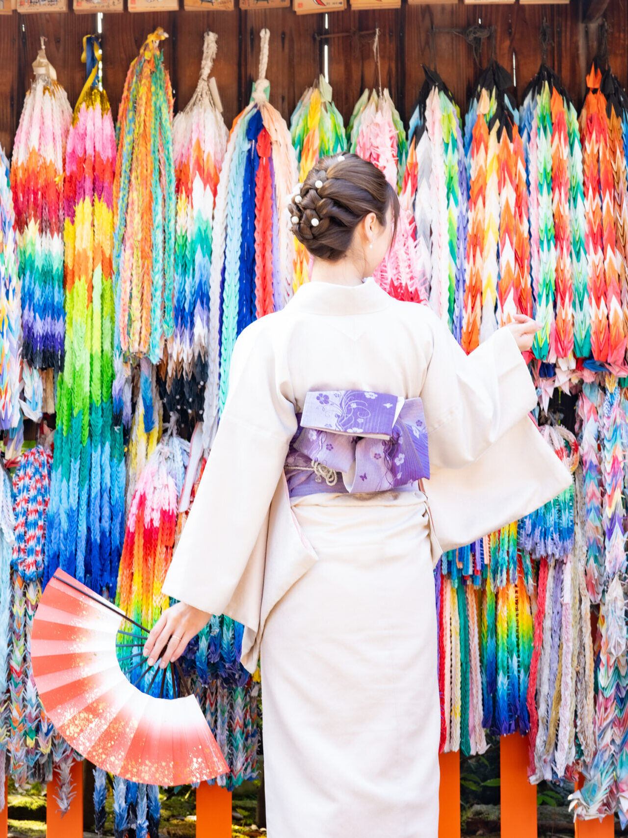 穿著和服漫步於東丸神社,明亮或淡雅的和服色彩與色彩繽紛的紙鶴交織,營造出極具京都風情且充滿祝福氣息的畫面。無論是祈福或拍照留念,都是體驗日本傳統文化的絕佳選擇。
