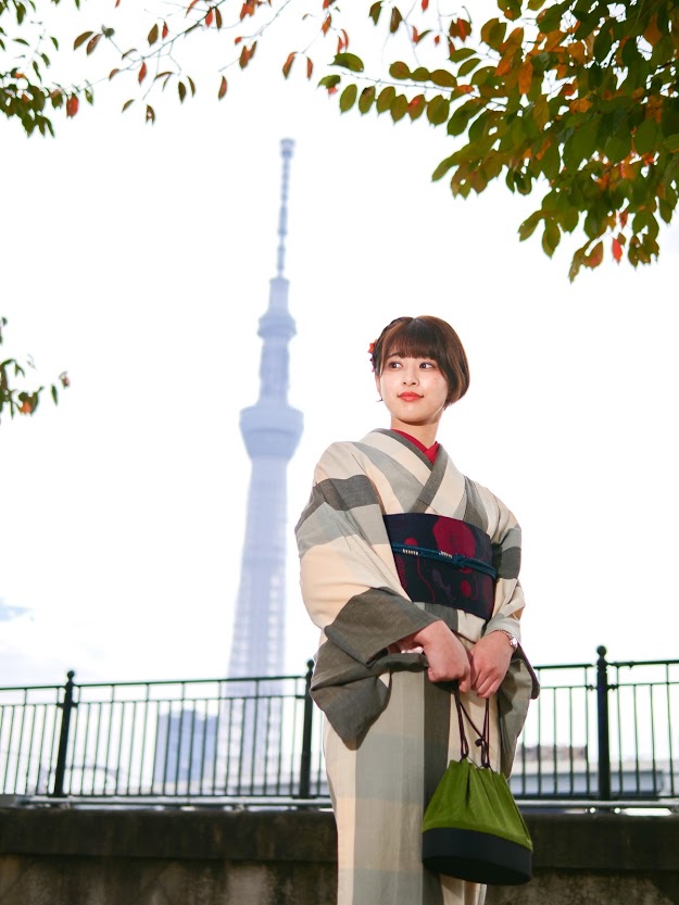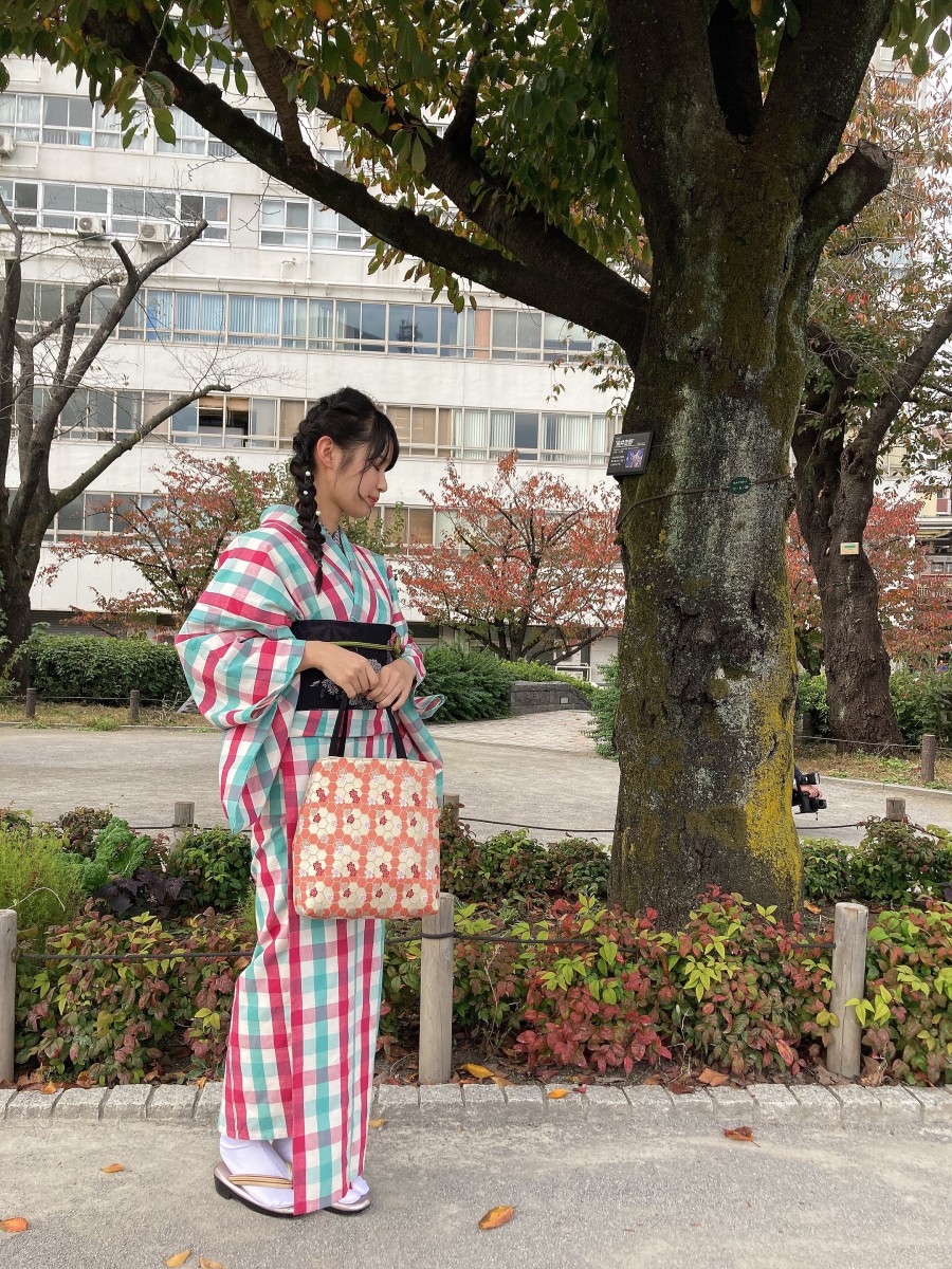 シンプルな格子柄の伊勢木綿着物をお召しになって、小物を足してコーディネートは完成しました。