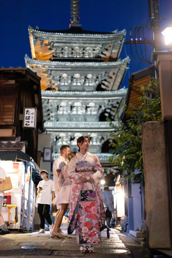 以京都夜景為背景,拍攝夢幻般的和服美照。留下與白天截然不同的專屬回憶。