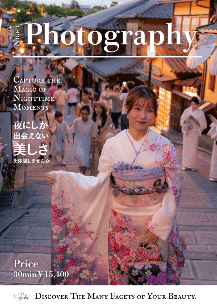 Enjoy a magical photo session with Kyoto’s night scenery as your backdrop. Capture a special moment that feels completely different from the daytime.
