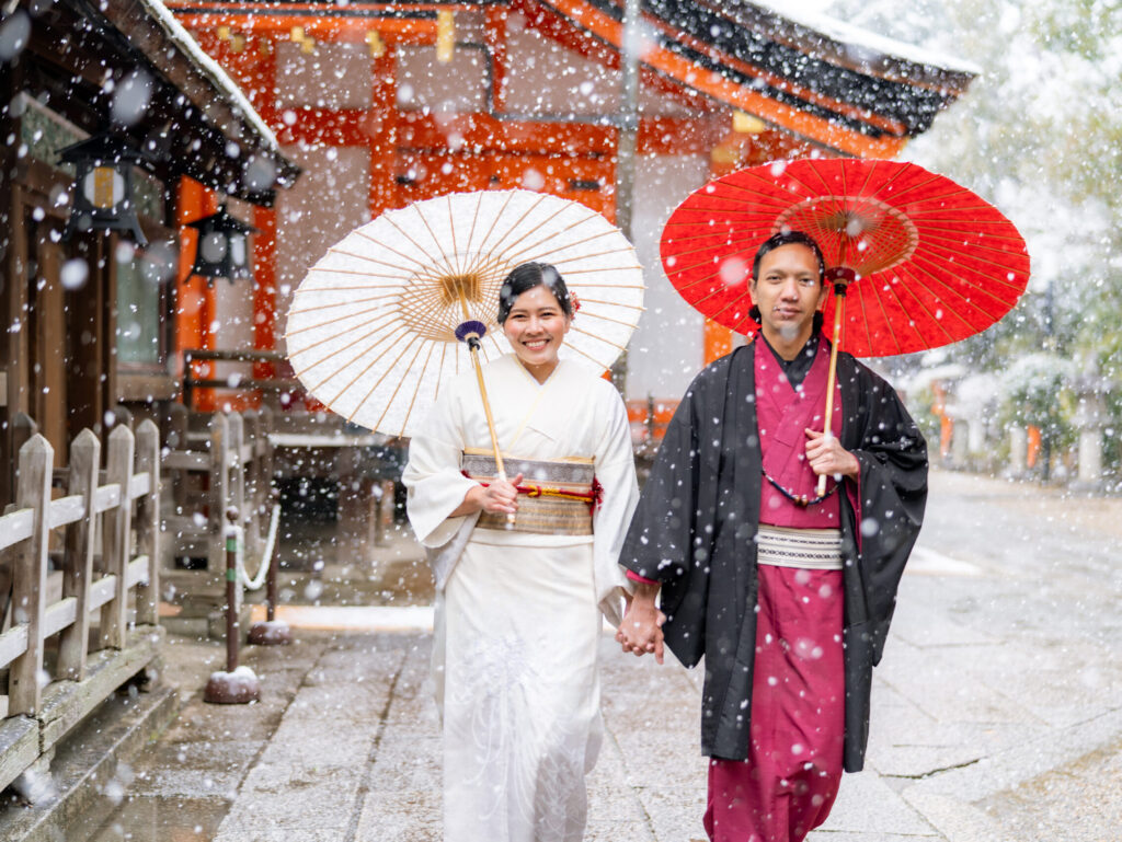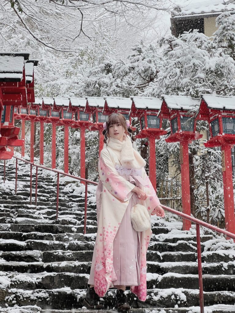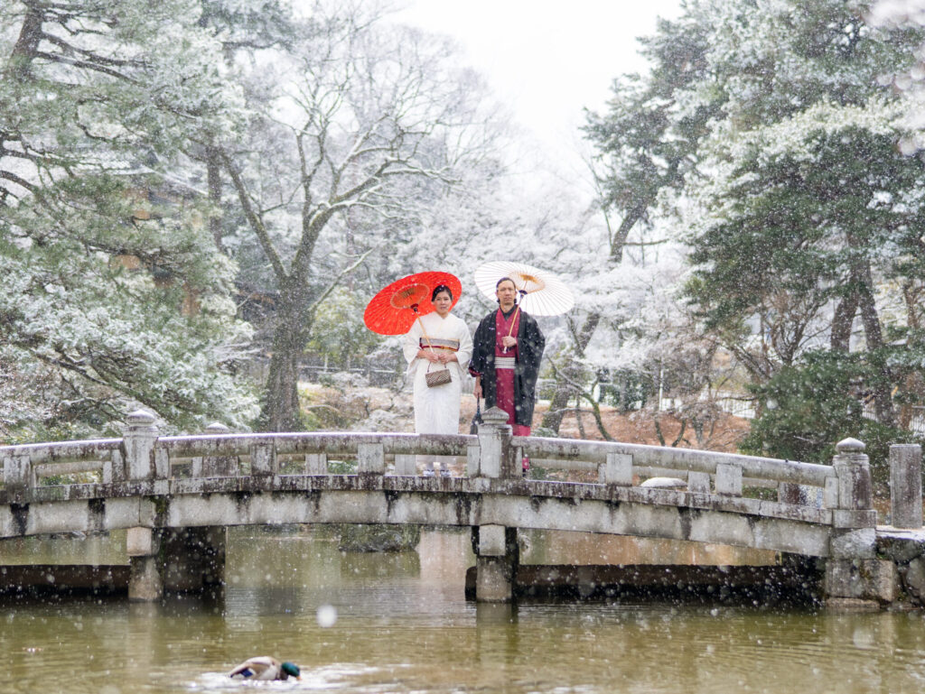 静けさに包まれた冬の京都。運が良ければ、雪化粧の京都に出会えることも。和服姿で歩けば、幻想的で特別な一日を演出できます。