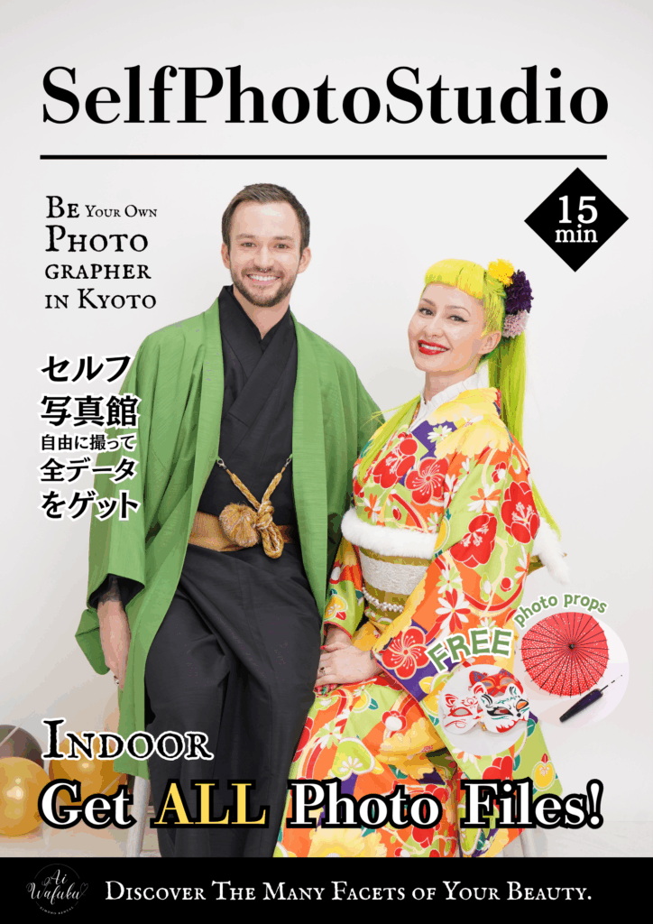 Enjoy 15 minutes of unlimited shooting in our indoor self-photo studio! Take home all the photo data you capture, and enhance your shots with free props such as Japanese umbrellas, bouquets, and masks. A fun and weather-proof photo experience.