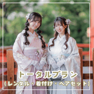 ・1点でも当店のものをレンタルされる場合は「トータルプラン(¥24,000)」の適用となります。例えば、振袖のみ持ち込みで、あとの袴や着付け小物などをレンタルされる方は「トータルプラン(¥24,000)」の適用に変更となります。