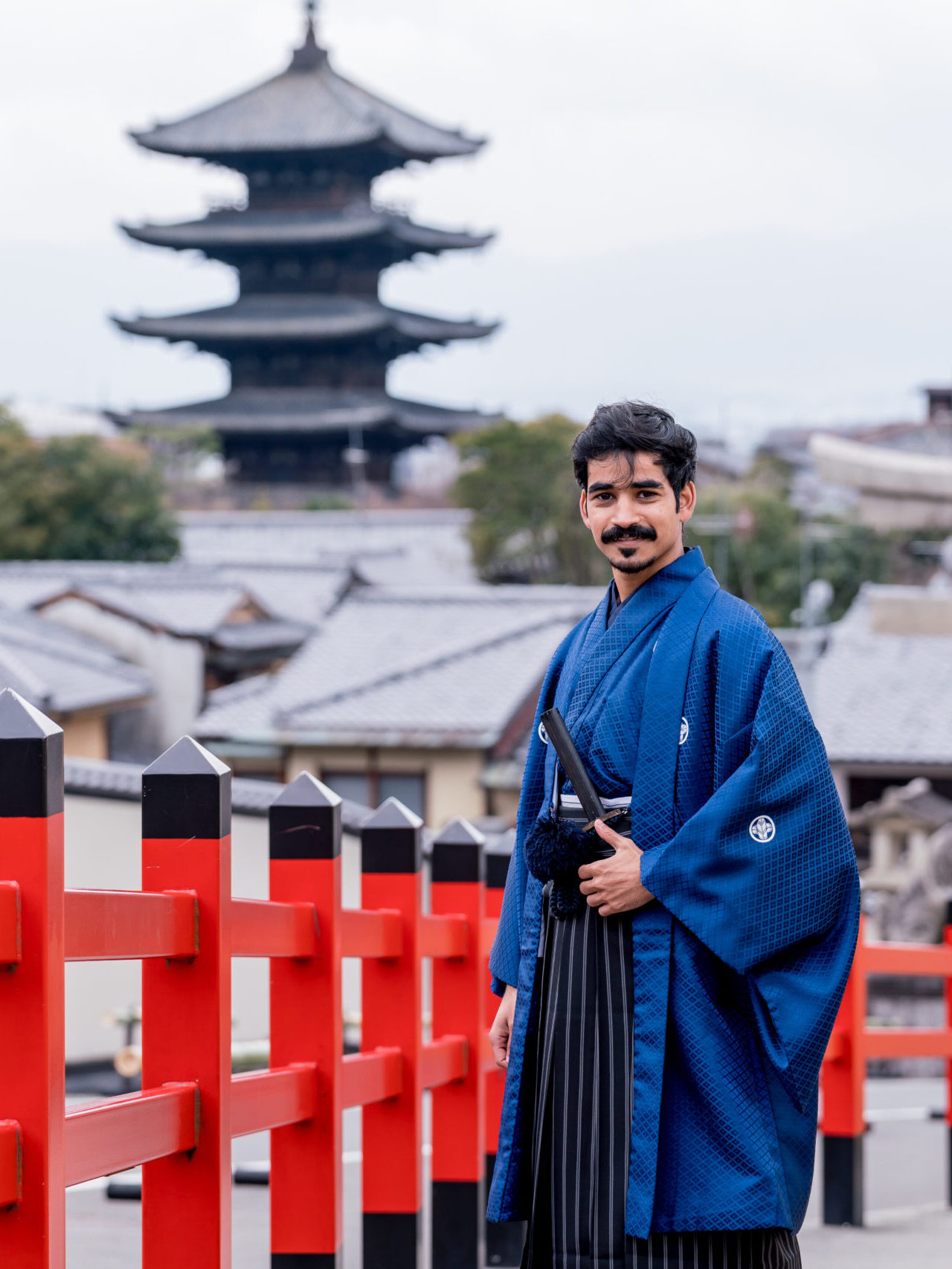 以五重塔為背景,一位穿著莊重紋付袴的男子,與一位穿著華麗振袖的女子並肩而行。