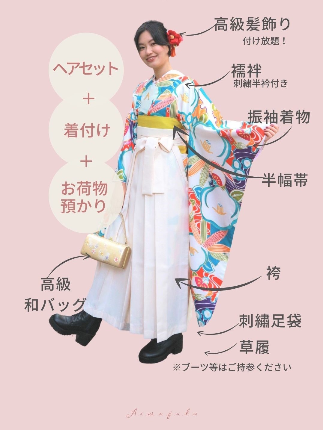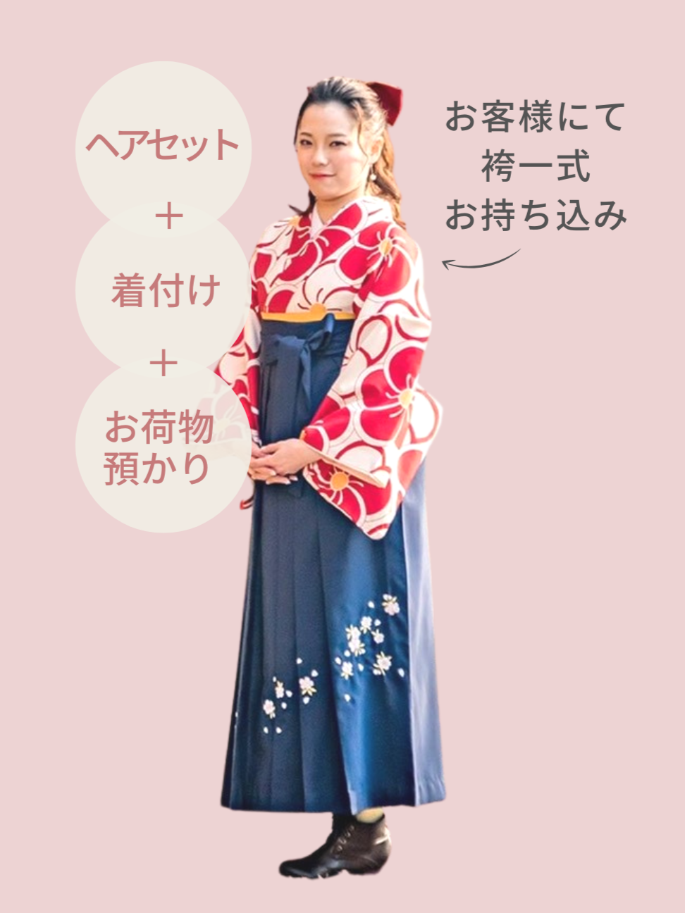 こちらのプランは、卒業式袴一式のレンタル・着付け・ヘアセット・荷物預かりすべて愛和服にお任せしてほしい方に最適なプランです。