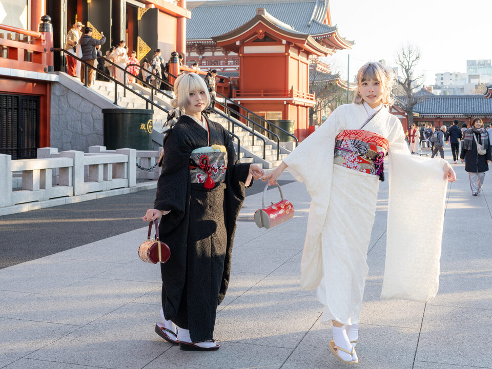伝統的な商店街が続く仲見世通りでは、賑やかな雰囲気と着物姿がよく合います。