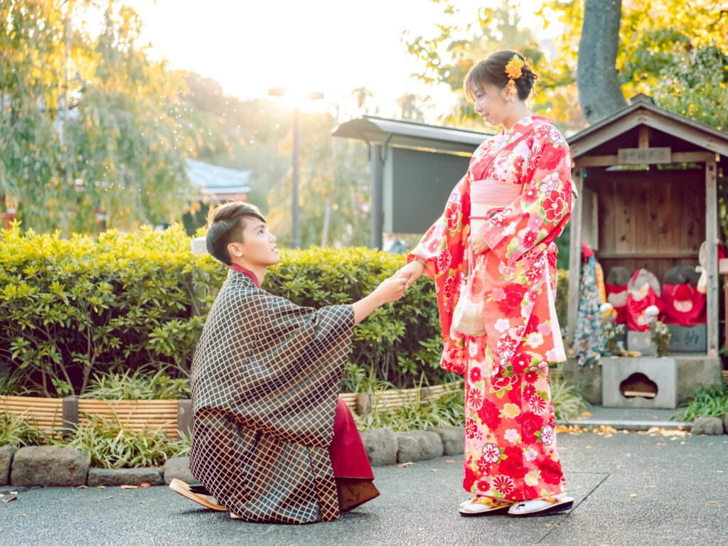 浅草・雷門でのデートに人気の「カップルプラン」は、男女2名でお得に着物レンタルが楽しめるプランです。おそろいコーデや色違いの帯でリンクスタイルもおすすめ。浅草寺や仲見世通りなど観光名所を着物姿で歩けば、写真映えも抜群。特別な一日を二人でお楽しみください。
