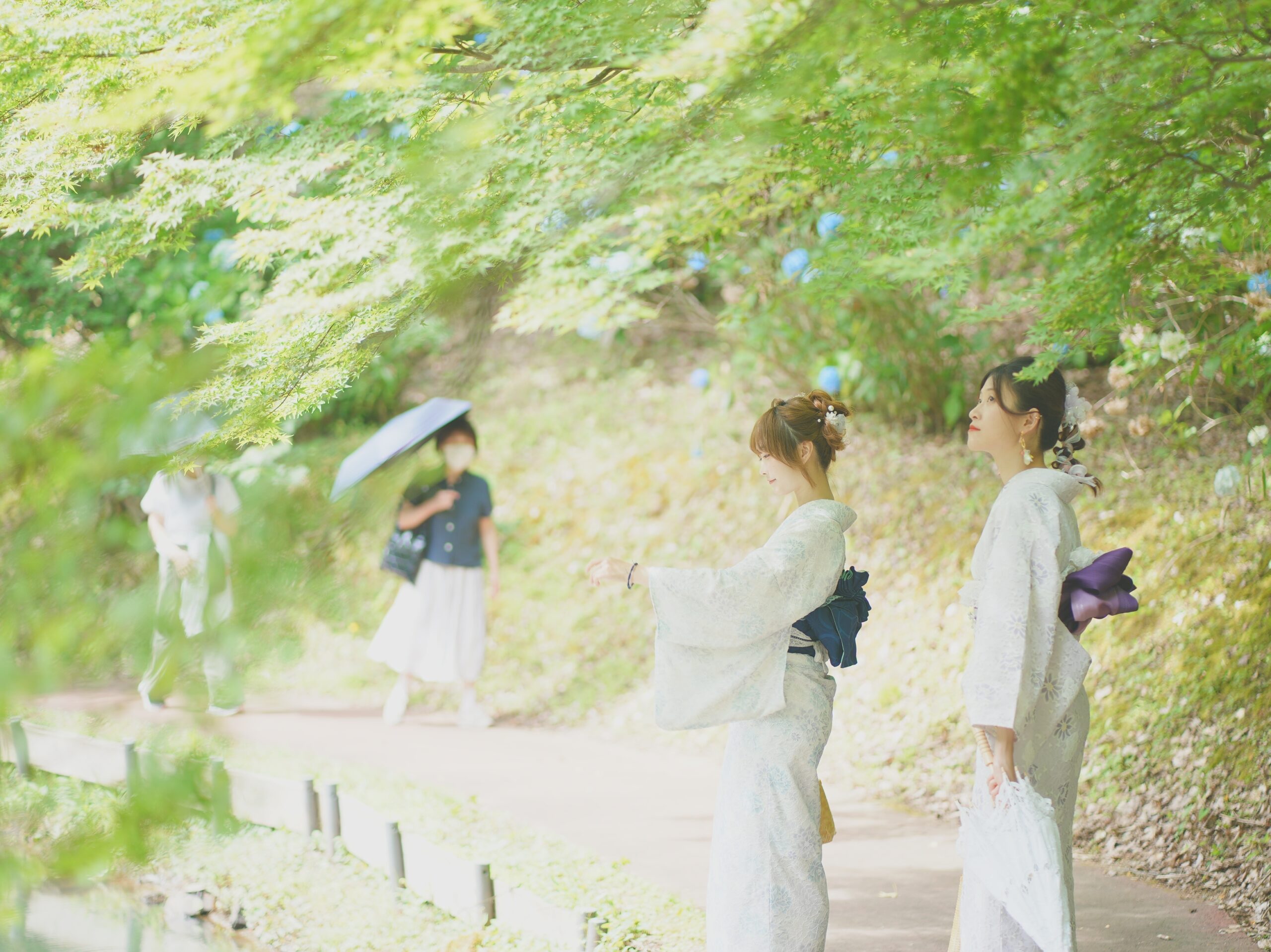 友達同士で同じ柄や色違いの浴衣を着る“双子コーデ”もSNS映え抜群。小物や髪型まで揃えると、さらに一体感のある写真に仕上がります。
